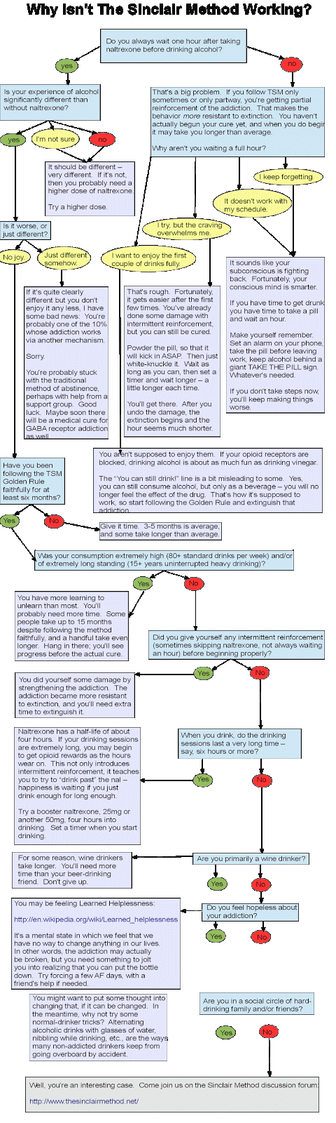 Wow melissa, you've been busy! I like the flowchart...an interesting idea. I guess my feedback is a bit like Kerri's. It's the "is your drinking significantly different" part. I don't know how to answer that. It is in that I don't get drunk when I take nal and alcohol, I don't want to drink anywhere near as much and most importantly I find my brain telling me after a couple "I've had enough" without any concious effort on my part. But, my reaction isn't "no joy", it's not an unpleasant reaction when drinking and the wine doesn't taste like vinegar. For me, at the moment, I still like wine and get a different level of enjoyment out of it but the switch which said "have more" has been turned off....the switch that says "have some" is still in the on position.